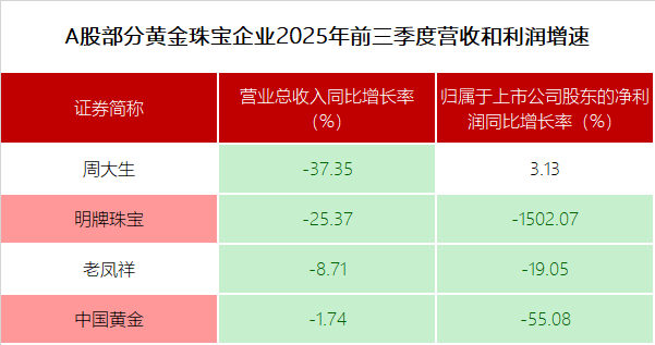 另一方面,金价的大幅上涨,对于下游黄金珠宝类企业的影响则是另外一番光景,行业内不少企业今年前三季度业绩同比下滑。比如,周大生、明牌珠宝、老凤祥、中国黄金等上市黄金珠宝企业2025年前三季度营业收入同比均不同程度下滑,其中明牌珠宝、老凤祥、中国黄金2025年前三季度归属于上市公司股东的净利润同比也出现下滑。
