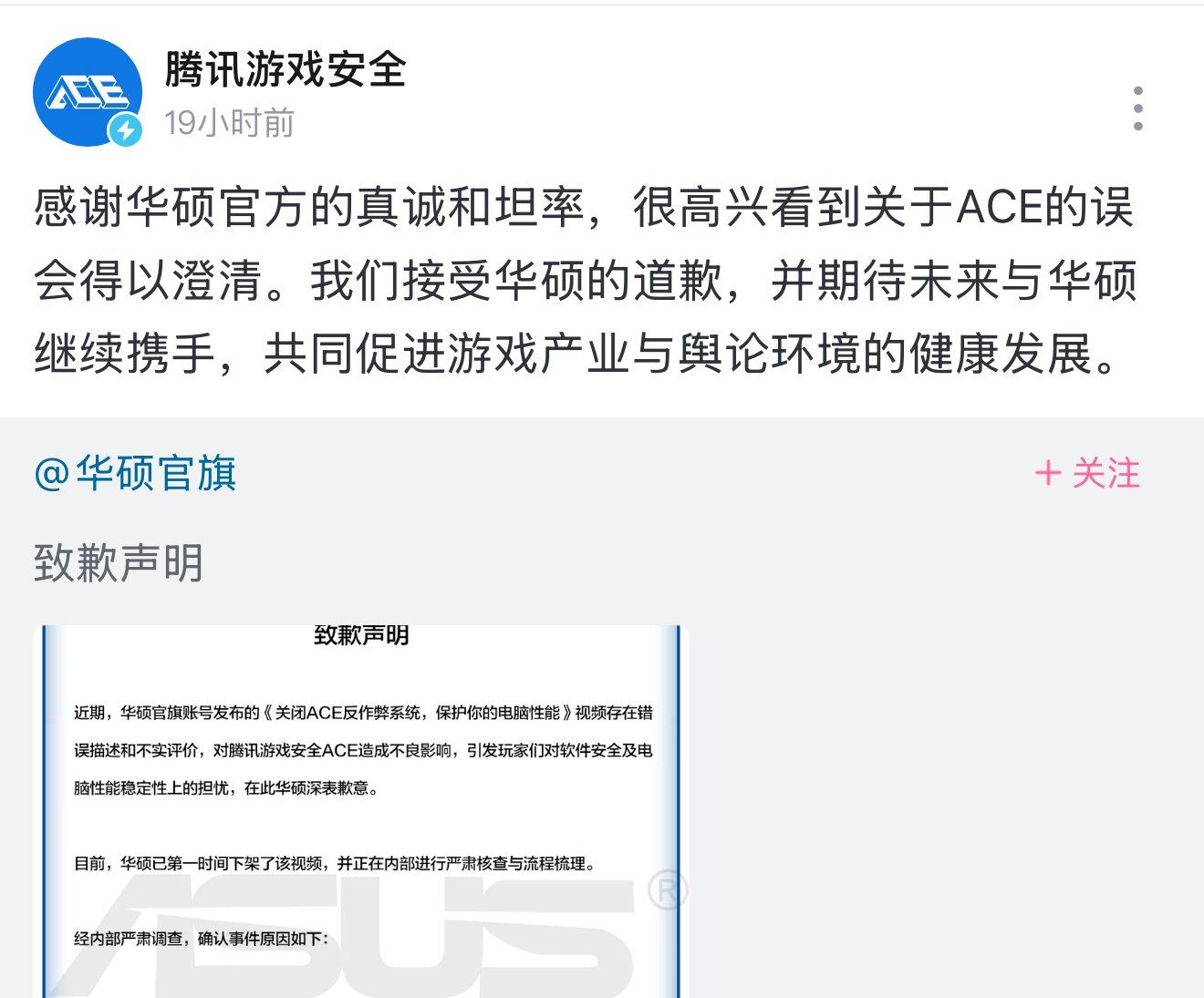 在华硕发布上述声明后,腾讯游戏安全随即转发并回应:“感谢华硕官方的真诚和坦率,很高兴看到关于ACE的误会得以澄清。我们接受华硕的道歉,并期待未来与华硕继续携手,共同促进游戏产业与舆论环境的健康发展。”