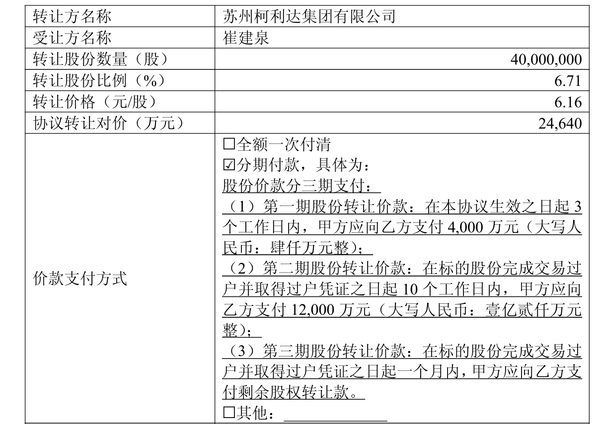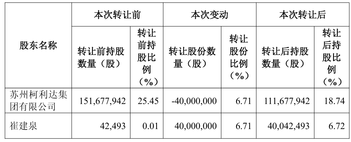 11月5日晚间,ST柯利达(603828)发布公告称,公司控股股东苏州柯利达集团与崔建泉签署股份转让协议,拟通过协议转让方式将其持有的4000万股无限售流通股转让给崔建泉,转让股份占公司当前总股本的比例为6.71%。