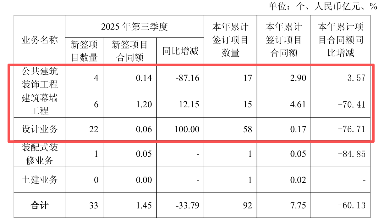 具体业务来看,公司前三季度主要业务公共建筑装饰工程、建筑幕墙工程、设计业务累计签订项目合同额分别为2.90亿元、4.61亿元、0.17亿元,同比变动3.57%、-70.41%、-76.71%。