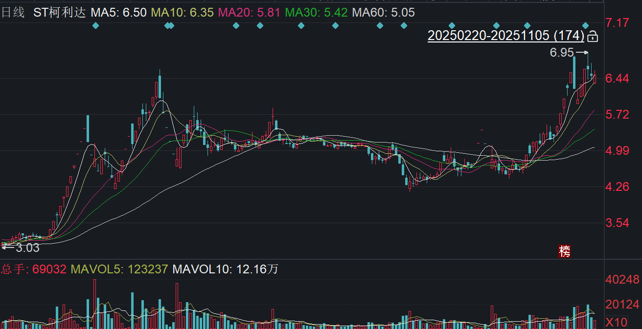 二级市场上,截至11月5日收盘,ST柯利达上涨0.31%报6.50元/股,总市值约38.74亿元,今年来公司股价累计上涨约124%。