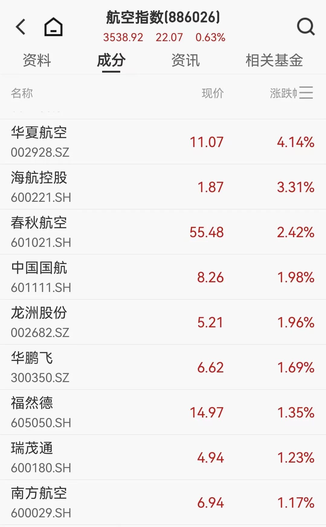 今日A股市场上,航空股开盘后一路走高,南方航空、中国国航一度涨近2%,华夏航空一度涨超5%。
