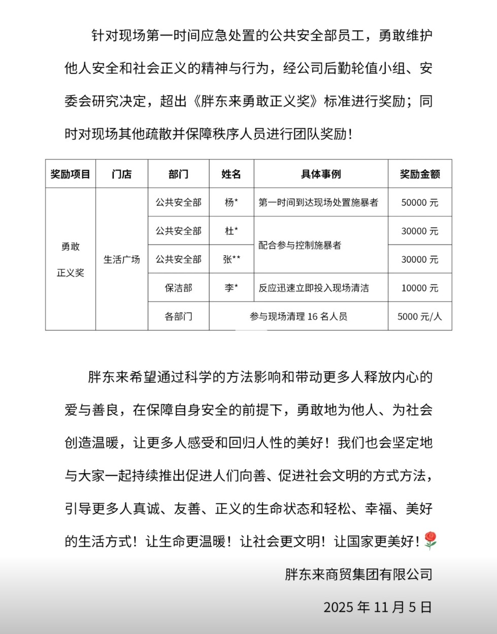 11月5日,胖东来就生活广场故意伤害事件发布员工勇敢正义奖励公示。
