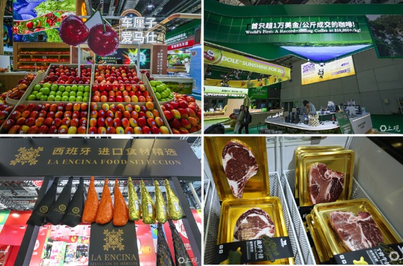 第八届进博会农食产品展区以“从全球农场到中国餐桌”为主题,西班牙火腿、1万美金一公斤的咖啡、战斧牛排、车厘子中的爱马仕等高端农产品悉数登场。解放日报张海峰摄