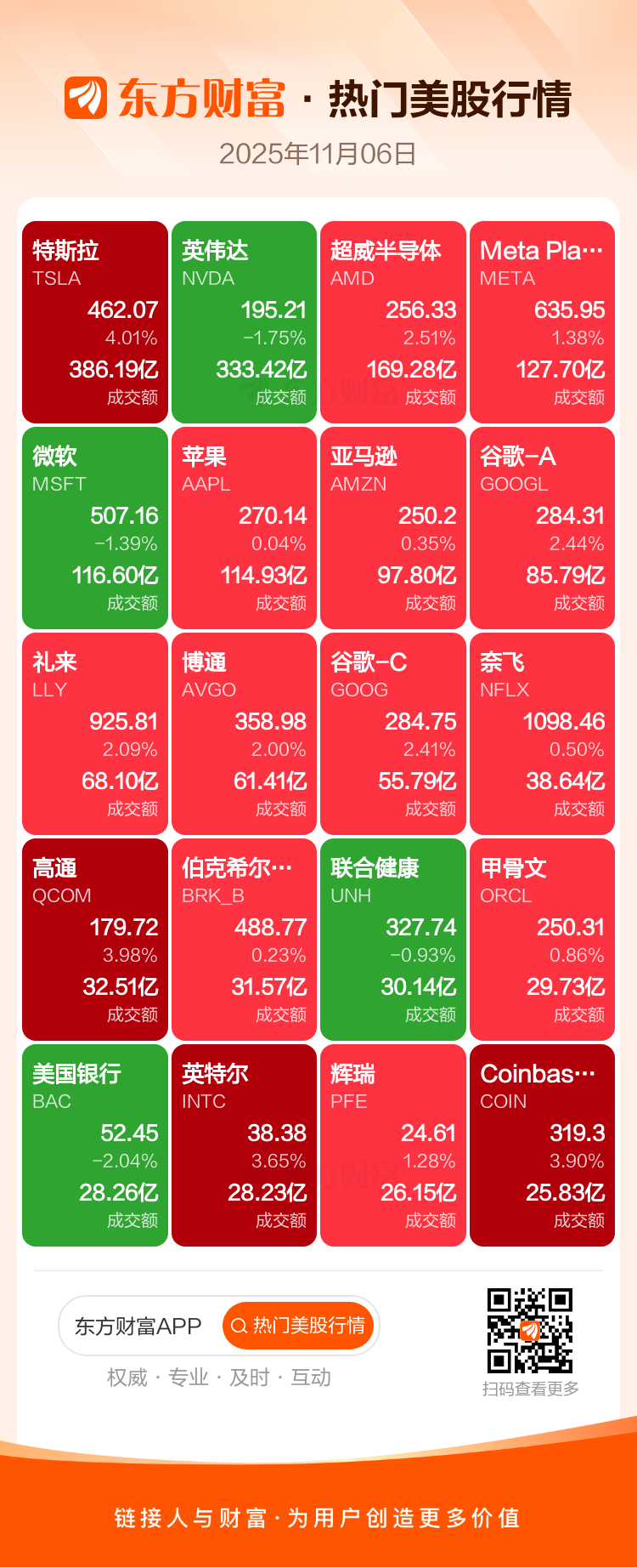特斯拉涨4.01%英伟达跌1.75%超威半导体涨2.51%Meta Platforms Inc-A涨1.38%微软跌1.39%苹果涨0.04%亚马逊涨0.35%谷歌-A涨2.44%礼来涨2.09%博通涨2.00%