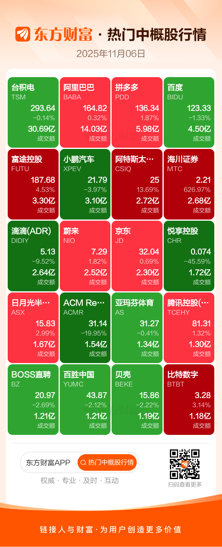 台积电跌0.14%阿里巴巴涨0.32%拼多多涨1.87%百度跌1.33%富途控股涨4.53%小鹏汽车跌3.97%阿特斯太阳能涨13.69%海川证券涨626.97%滴滴(ADR)跌9.52%蔚来涨1.82%
