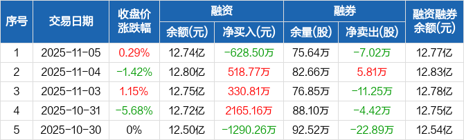 融资方面,当日融资买入5255.96万元,融资偿还5884.46万元,融资净偿还628.5万元。融券方面,融券卖出4.03万股,融券偿还11.05万股,融券余量75.64万股,融券余额263.98万元。融资融券余额合计12.77亿元。