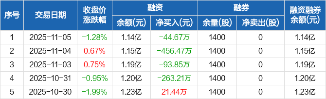 融资方面,当日融资买入791.69万元,融资偿还836.36万元,融资净偿还44.67万元,连续4日净偿还累计858.2万元。融券方面,融券卖出0股,融券偿还0股,融券余量1400股,融券余额5.82万元。融资融券余额合计1.14亿元。