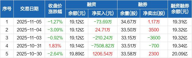 融资方面,当日融资买入7846.12万元,融资偿还7919.82万元,融资净偿还73.69万元。融券方面,融券卖出1.5万股,融券偿还3320股,融券余量34.67万股,融券余额1994.7万元。融资融券余额合计19.31亿元。