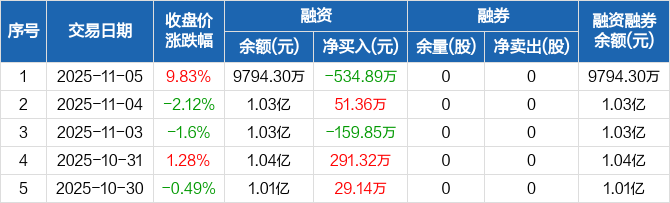 万德斯:融资净偿还534.89万元,融资余额9794.3万元(11-05)