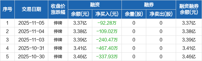 融资方面,当日融资买入0元,融资偿还92.28万元,融资净偿还92.28万元,连续7日净偿还累计2353.68万元。融券方面,融券卖出0股,融券偿还0股,融券余量0股,融券余额0元。融资融券余额合计3.37亿元。