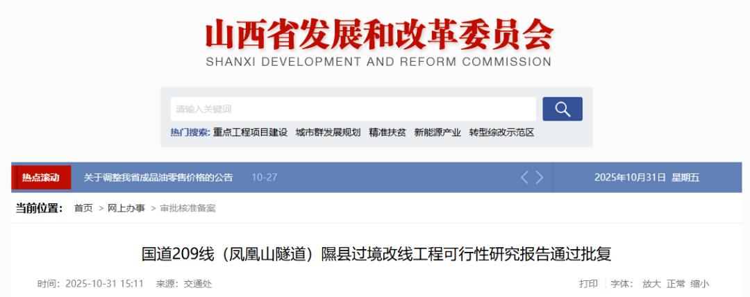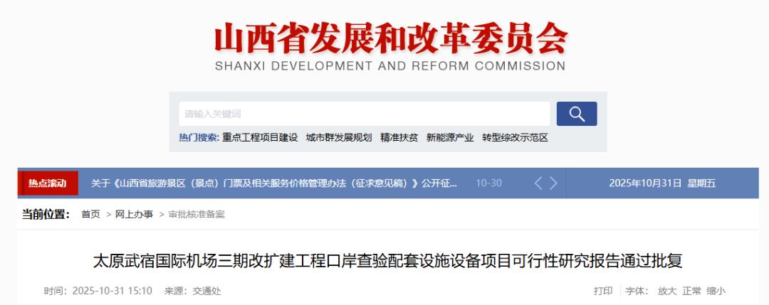 10月31日,山西省发展和改革委员会连发两项交通领域重要批复,太原武宿国际机场三期改扩建工程口岸查验配套设施设备项目、国道209线(凤凰山隧道)隰县过境改线工程可行性研究报告均正式通过审批,总投资合计超22亿元,分别从航空枢纽功能升级与县域公路通行优化两大维度,为山西综合交通运输体系建设注入新动能。