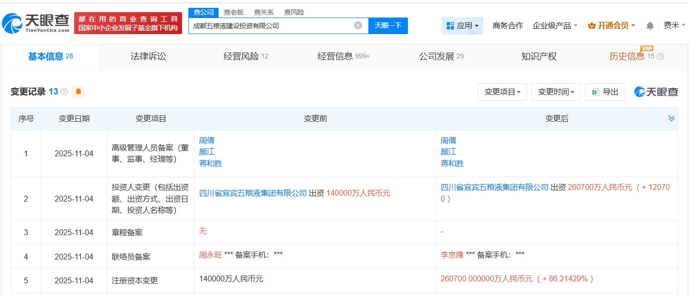 五粮液集团旗下成都建设投资公司增资至26.07亿