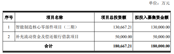 公告显示,其中13亿元用于智能制造核心零部件项目,5亿元用于补充流动资金及偿还银行借款项目。