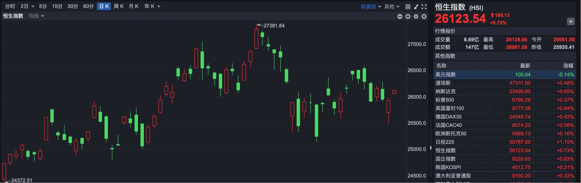 截至发稿,恒生指数报26123点,上涨188点,涨幅0.73%。