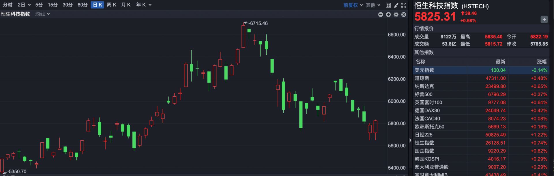 恒生科技指数报5825点,上涨39点,涨幅0.68%。