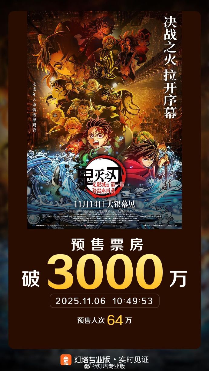 电影《鬼灭之刃:无限城篇 第一章 猗窝座再袭》预售票房破3000万