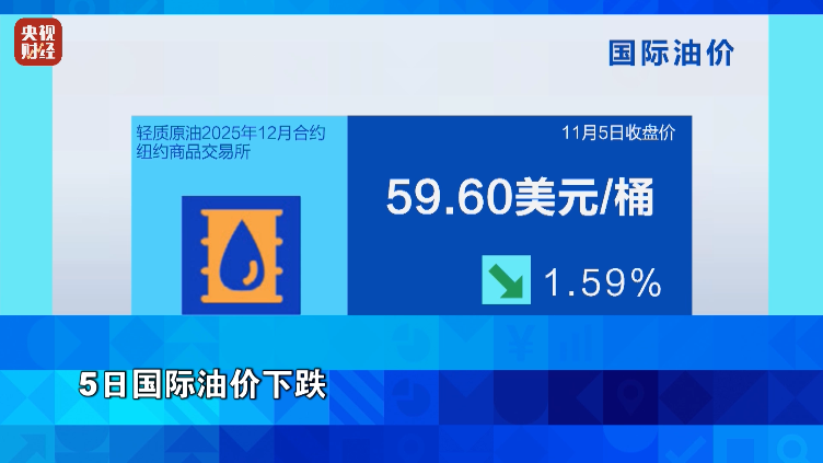 原油期货方面,美国能源信息局周三公布的数据显示,上周美国商业原油库存环比大增约520万桶,增幅远超预期,引发投资者对美国石油需求疲软的担忧,国际油价周三下跌。截至收盘,纽约商品交易所12月交货的轻质原油期货价格收于每桶59.60美元,跌幅为1.59%;2026年1月交货的伦敦布伦特原油期货价格收于每桶63.52美元,跌幅为1.43%。