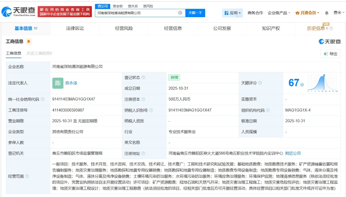 天眼查工商信息显示,近日,河南省深地清洁能源有限公司成立,法定代表人为陈永泽,注册资本500万人民币,经营范围包括工程和技术研究和试验发展、基础地质勘查、地质勘查技术服务等。股权全景穿透图显示,该公司由清洁能源产业技术研究院、新天然气(603393)旗下河南鑫泰清洁能源科技有限公司、神火股份(000933)共同持股。