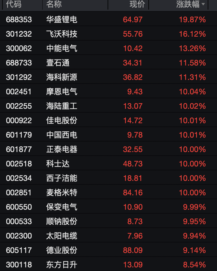 具体行业板块和赛道方面,电力设备板块再度大涨,申万电力设备指数涨幅超过2%,该指数盘中创出年内新高。板块内个股则掀起涨停潮,其中华盛锂电、中能电气、海科新源等多股涨幅超过10%,另有摩恩电气、海陆重工、佳电股份、中国西电、正泰电器、科士达、保变电气、顺钠股份、太阳电缆等多只股票涨停。