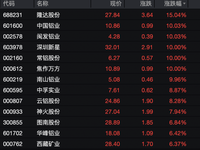 有色金属板块同样强势,板块涨幅接近3%。板块个股中,隆达股份涨超15%,中国铝业、闽发铝业、深圳新星等多股涨停,此外,中孚实业、云铝股份、西藏矿业等多股涨幅超过5%。