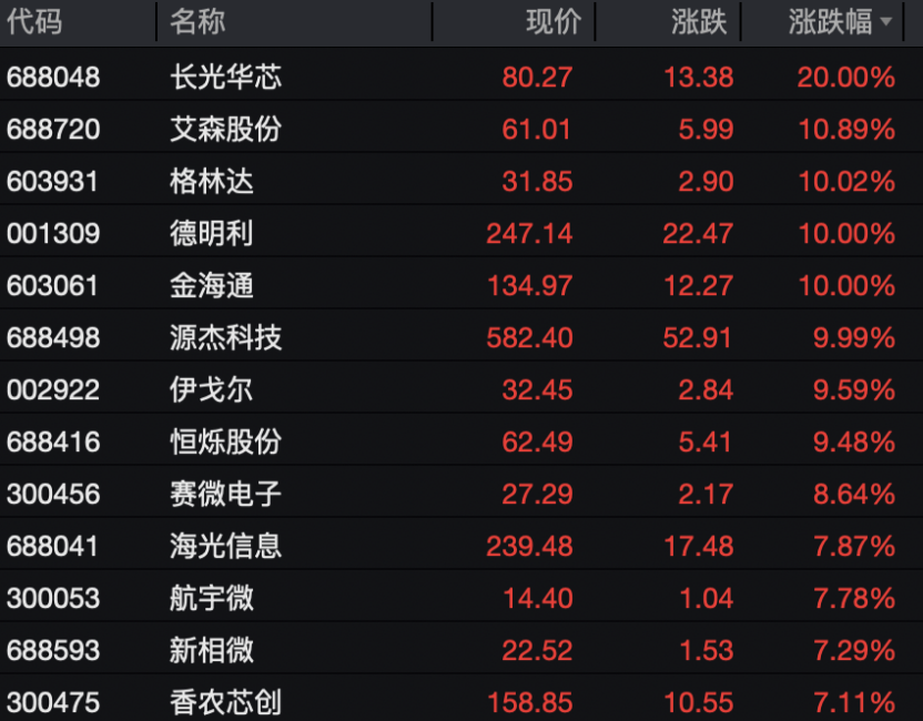 电子板块也涨幅居前,板块涨幅超过2%,长光华芯“20cm”涨停,格林达、德明利等股票涨停,另有多股跟涨。