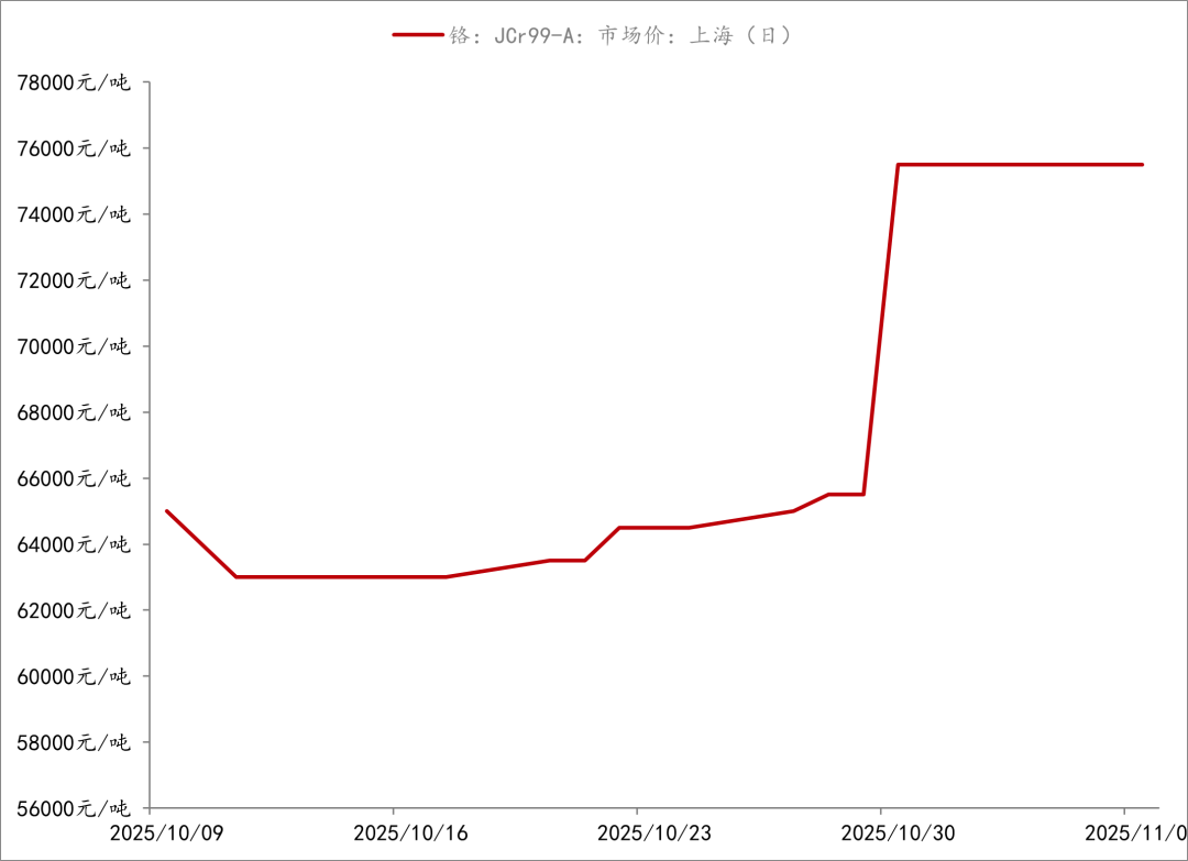 上海钢联数据显示,11月6日上海金属铬价格为7.55万元/吨,相较于10月21日的价格上涨18.9%。CBC金属铁合金网数据则显示,11月5日中国金属铬出厂含税均价为82500元/吨,较前一日上涨7000元/吨,相较于10月21日的价格上涨近28%。