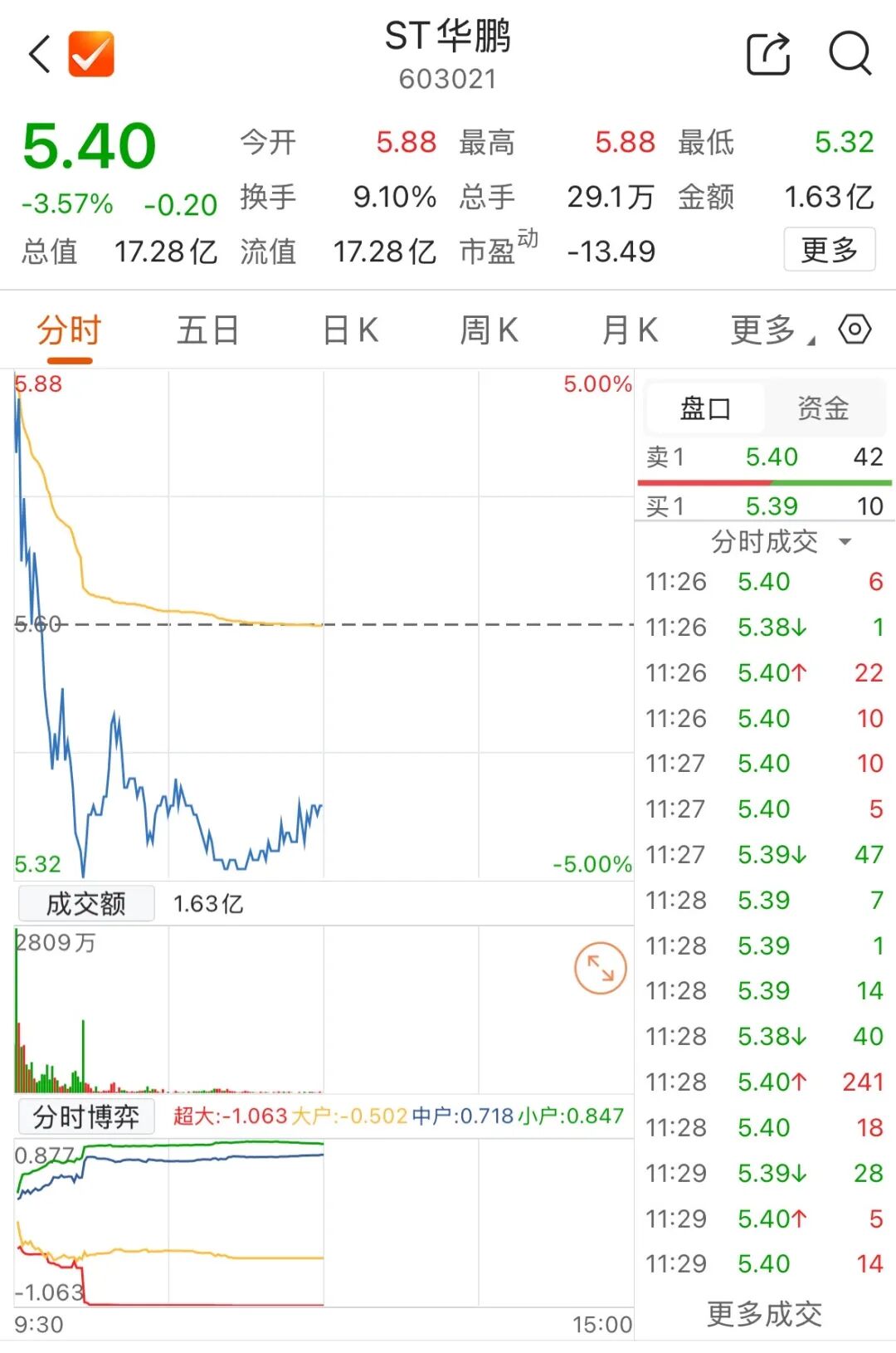 11月6日,此前已连续5个交易日涨停的ST华鹏再度以涨停价开盘,随后快速震荡下挫,并于盘中触及跌停,上演“天地板”。
