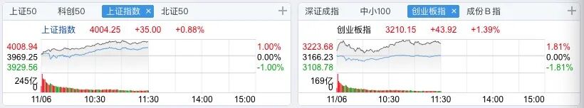 11月6日上午,A股三大指数早盘集体上涨。截至午间收盘,上证指数涨0.88%,深证成指涨1.39%,创业板指涨1.39%。沪深北三市半日成交13378亿元,较上个交易日同期放量1881亿元。全市场超2700只个股上涨。
