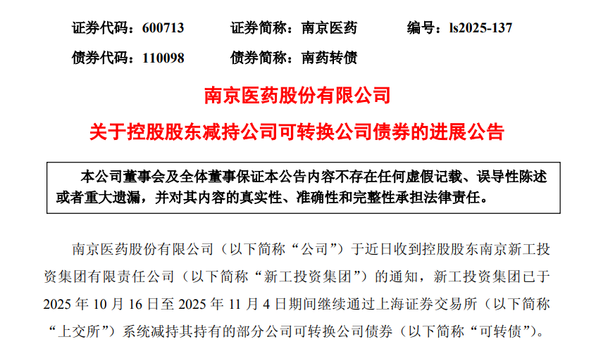 11月6日,南京医药(600713)发布公告称,公司控股股东南京新工投资集团有限责任公司(以下简称“新工集团”)于2025年10月16日至11月4日期间,通过上海证券交易所系统累计减持“南药转债”(债券代码:110098)110.041万张,占该可转债发行总量的10.17%。