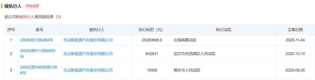 中国执行信息公开网显示,哪吒汽车母公司合众新能源汽车股份有限公司(下称“合众新能源”)新增一则被执行人信息,执行标的超2526万元。具体来看,执行法院为北海海事法院,立案时间为11月4日。