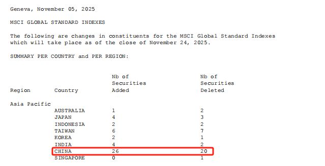 北京时间11月6日,MSCI指数公司发布2025年11月指数审核结果,旗下制定的多个国家和地区的指数成分股发生变更。其中,MSCI全球标准指数拟新增26只中国股票,剔除20只,数量在本次审核中最多,主要为港股上市企业。