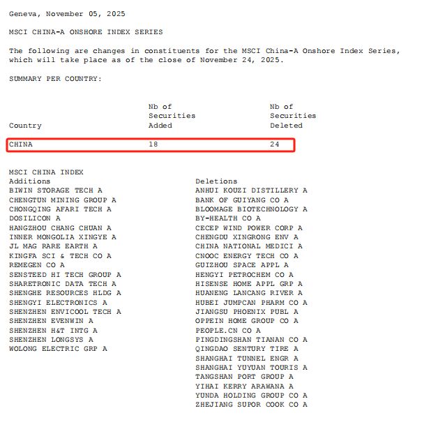MSCI全球标准指数、MSCI中国A股在岸指数成分股均有调整