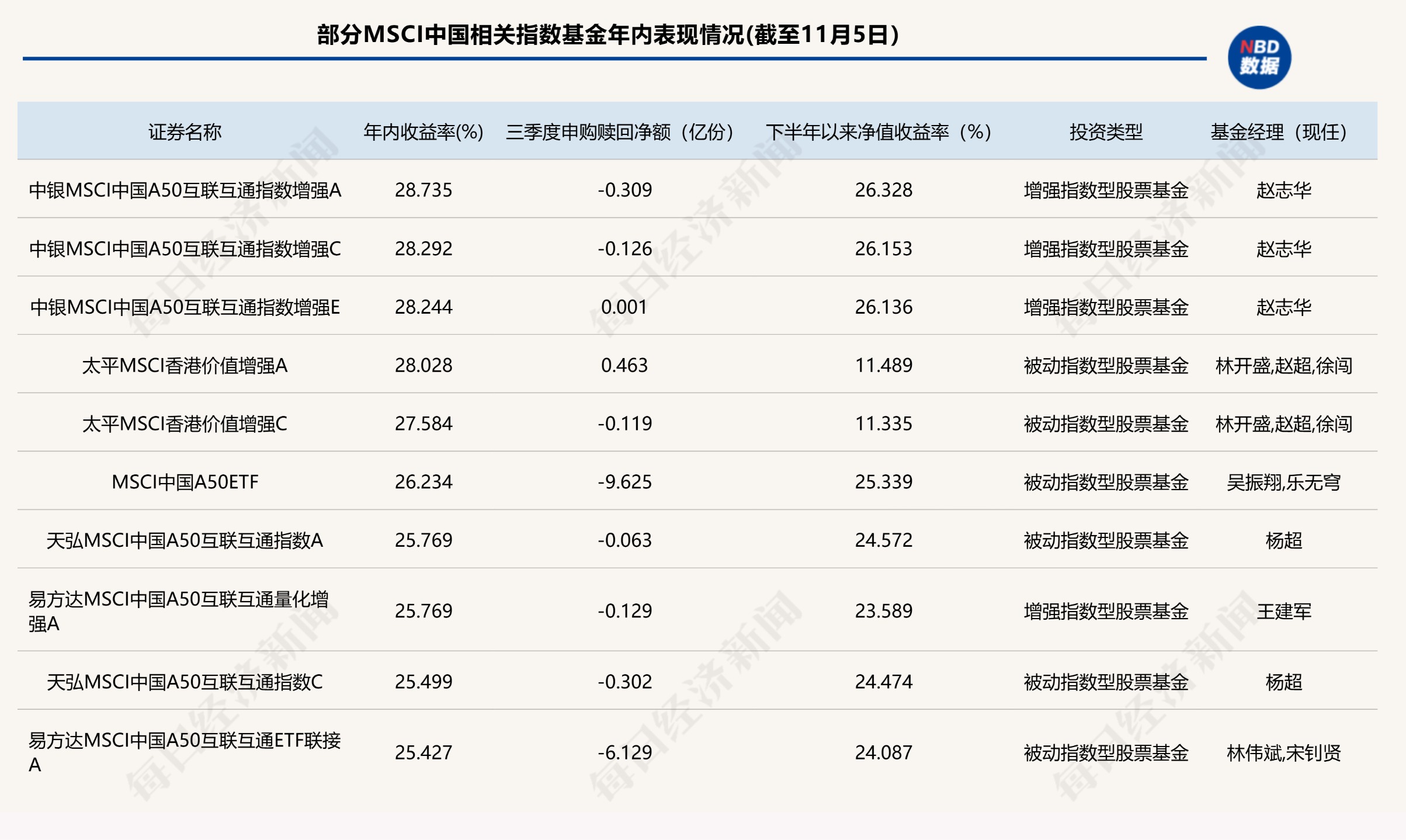 总体来看,有33只年内业绩已经超过20%,同期上证指数涨幅为18.42%,沪深300指数涨幅达17.6%。从基金跟踪的指数来看,除了MSCI中国A50互联互通指数外,还有MSCI香港价值增强指数、MSCI中国A股国际质量指数、MSCI中国A股指数等。