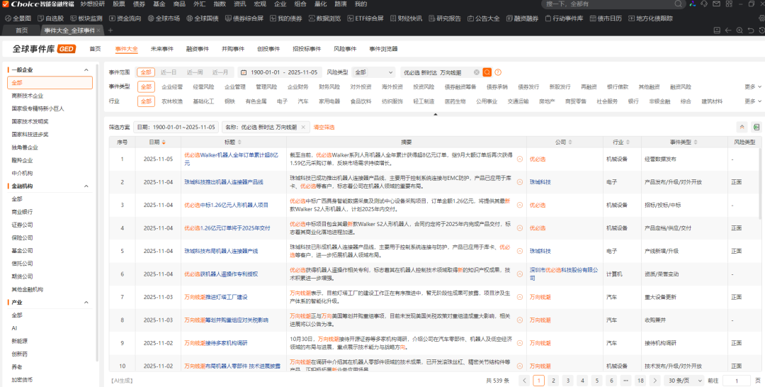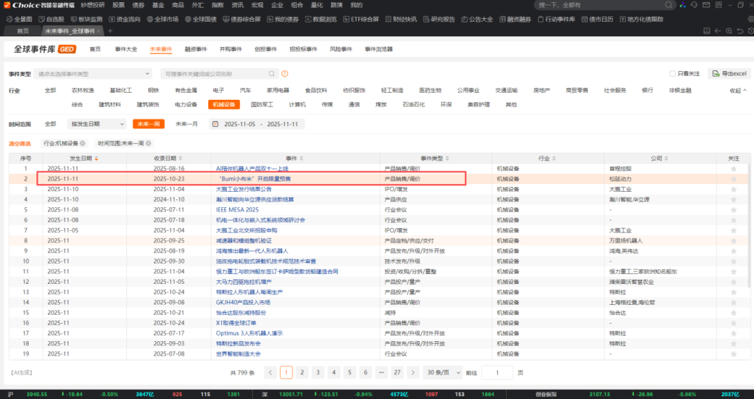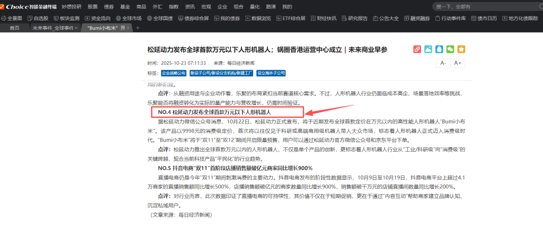 例如,在筛选机械设备行业的未来一周事件时,系统呈现松延动力小布米的预售信息,打开事件详情页面,全球首款万元以下的人形机器人进入大众市场。这一事件不仅标志行业转折,也预示上游供应商订单可能增加,并为竞品公司带来潜在市场压力。