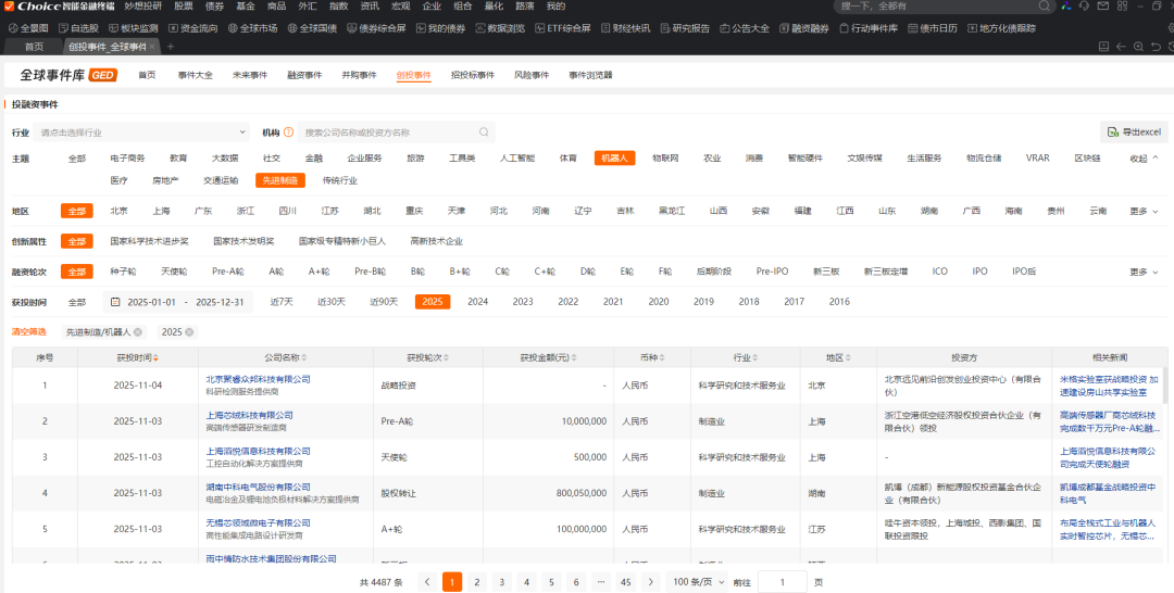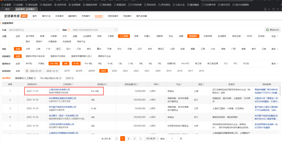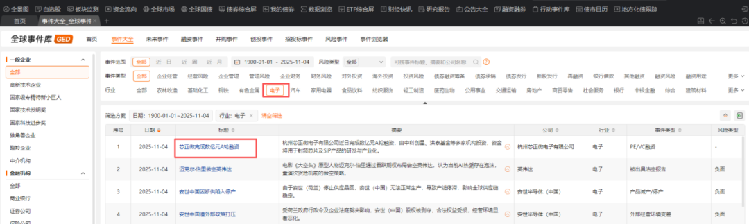 例如,输入人工智能、电子、新能源等关键词后,系统即刻呈现近期核心事件:“芯正微完成数亿元A轮融资”。进一步进入“创投事件”模块,设置融资阶段和时间范围,系统会自动提取所有符合条件的交易,清晰揭示出——同一赛道中多家企业密集获投,市场热度正在升温。