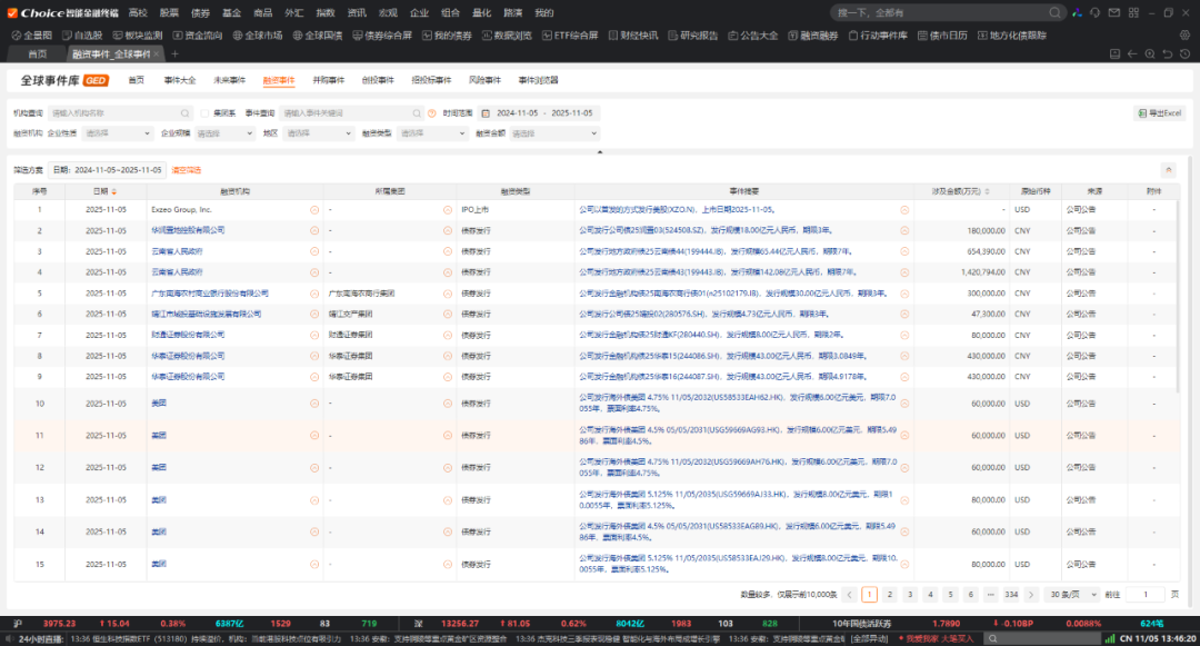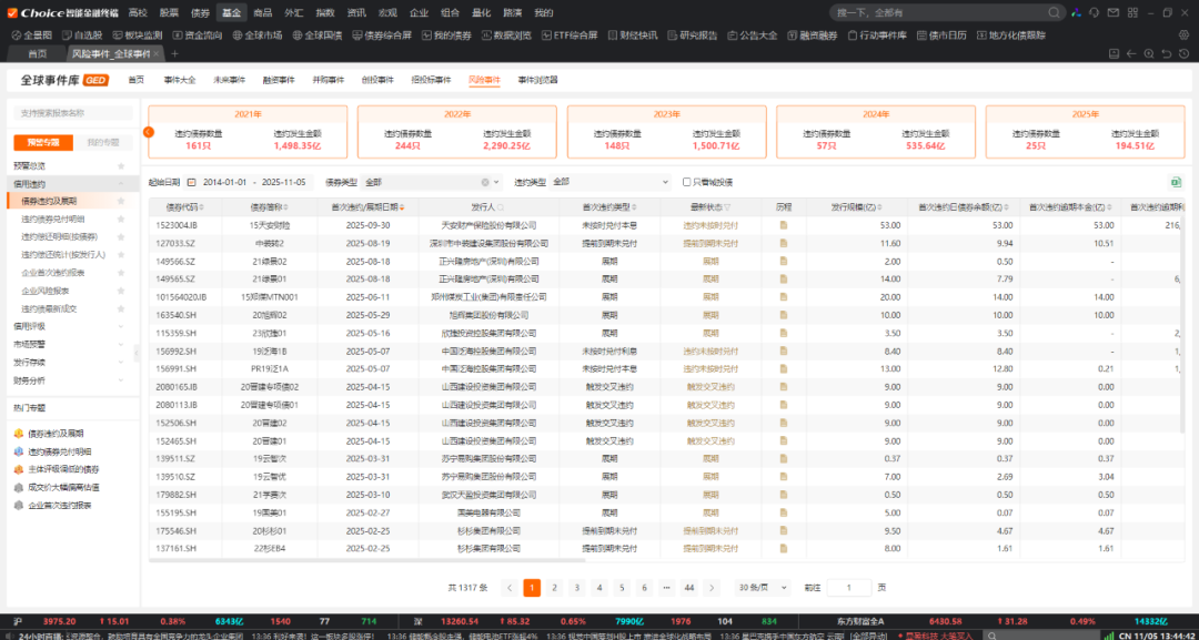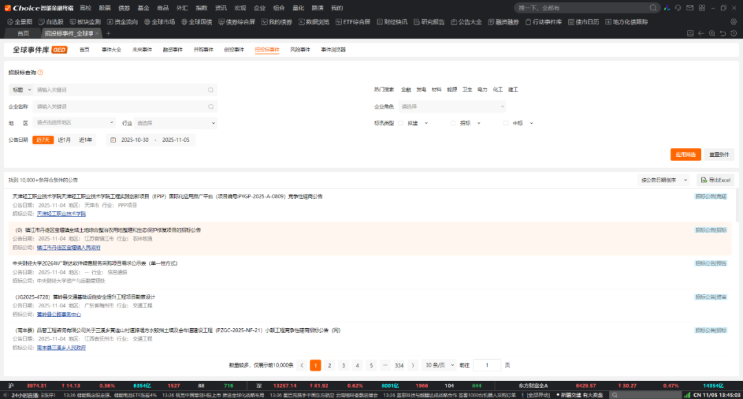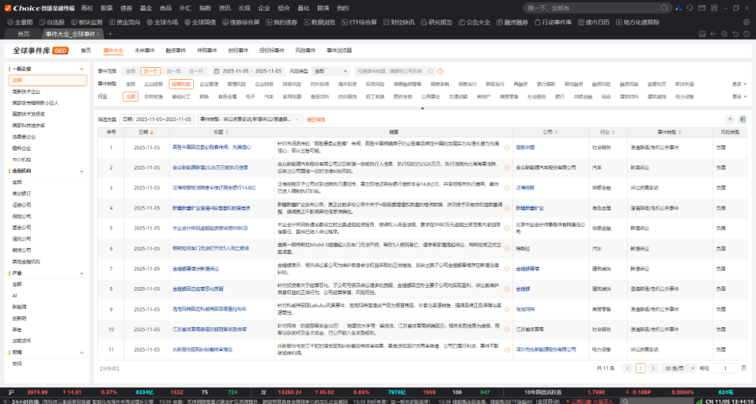 Choice“全球事件库”基于 AI 与大数据技术,7×24 小时监控全球数万信息源,将新闻、公告、微信公众号内容等零散资讯,结构化提炼为标准化事件数据。在事件库首页,用户即可通过事件看板快速洞察市场全貌。