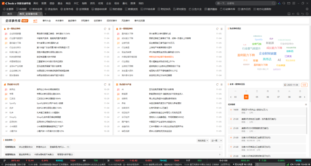 聚焦事件驱动投资,Choice“全球事件库”为专业投资者打造精准决策引擎。平台实时捕捉全球宏观政策、企业并购、财报预告等关键事件,结合深度数据建模与技术信号研判,帮助您量化事件影响强度、预判价格波动规律。通过“信号预警-归因分析-策略回测”一体化流程,将市场噪音转化为超额收益机会,实现基于确定性事件的系统化投资。