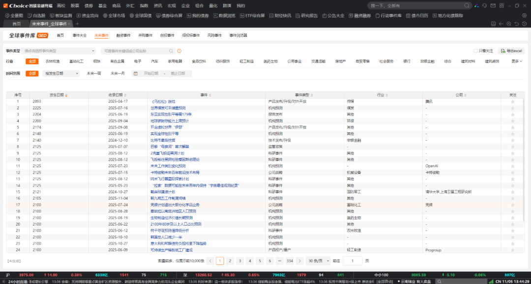 在行业研究中,传统财务数据往往滞后,无法及时反映市场需求和产业趋势。同时,宏观经济和政策周期性强,分析师需要敏锐捕捉拐点信号。全球事件库通过“未来事件”模块,帮助研究人员提前识别关键节点。