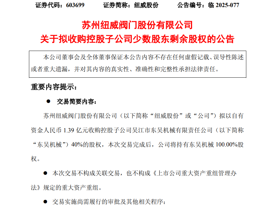 11月6日,纽威股份(603699)发布公告,公司拟以自有资金1.39亿元收购控股子公司吴江市东吴机械有限责任公司(简称“东吴机械”)40%的股权,本次交易完成后,公司将持有东吴机械100.00%股权。