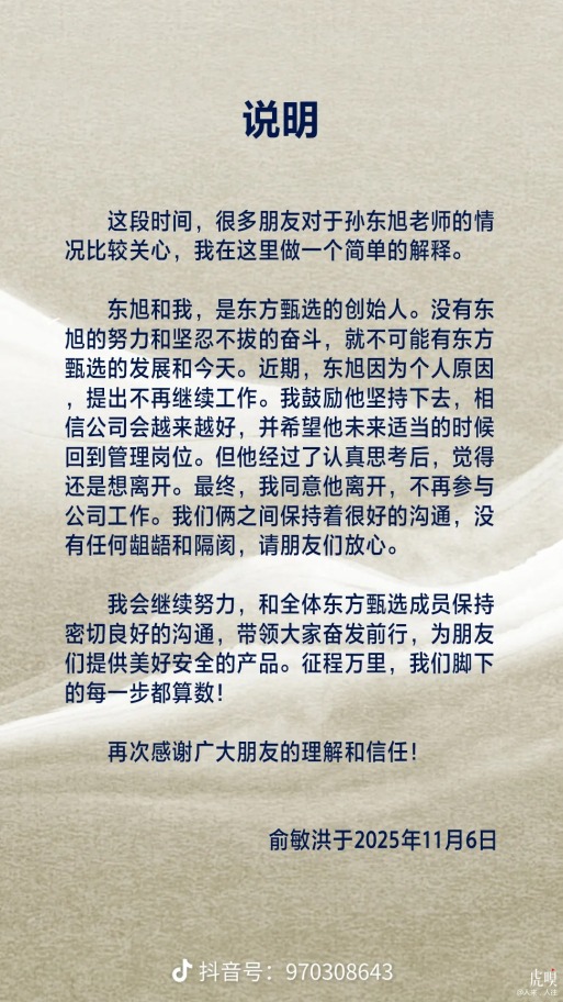 每经AI快讯,11月6日,俞敏洪发文:这段时间,很多朋友对于孙东旭老师的情况比较关心,我在这里做一个简单的解释。 东旭和我,是东方甄选的创始人。没有东旭的努力和坚忍不拔的奋斗,就不可能有东方甄选的发展和今天。近期,东旭因为个人原因,提出不再继续工作。我鼓励他坚持下去,相信公司会越来越好,并希望他未来适当的时候回到管理岗位。但他经过了认真思考后,觉得还是想离开。最终,我同意他离开,不再参与公司工作。我们俩之间保持着很好的沟通,没有任何龃龉和隔阂,请朋友们放心。 我会继续努力,和全体东方甄选成员保持密切良好的沟通,带领大家奋发前行,为朋友们提供美好安全的产品。