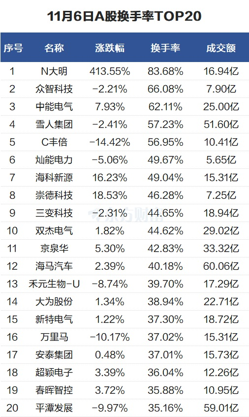 当天换手率最高的个股为N大明,全天换手率83.68%。众智科技紧随其后,全天换手率66.08%。