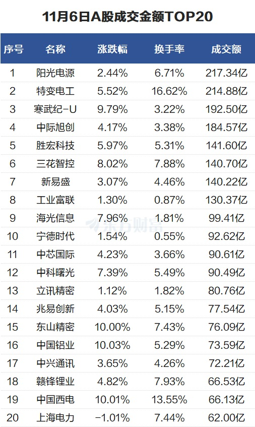 活跃个股:阳光电源成交217亿元 N大明换手率84%