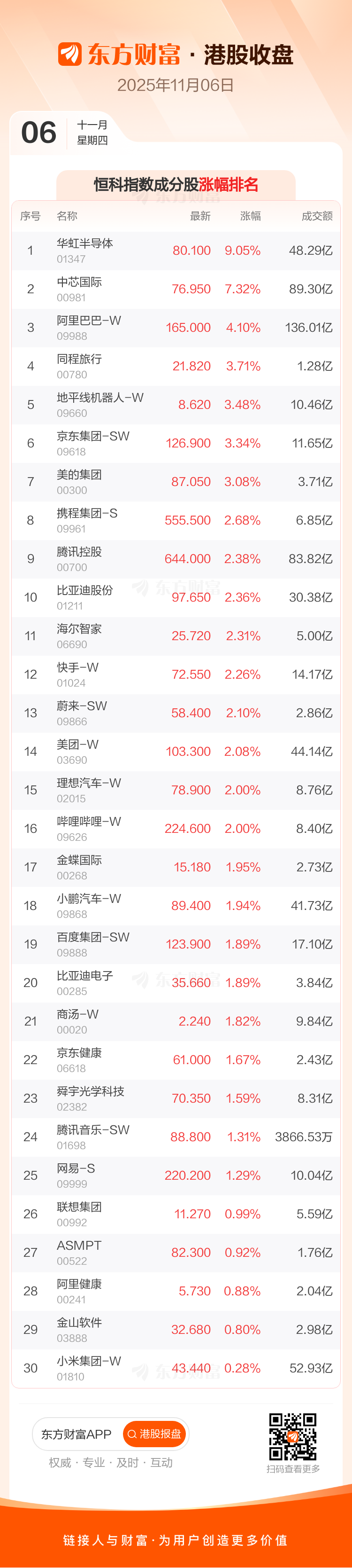 11月6日港股收盘:恒指涨2.12% 科技指数涨2.74%