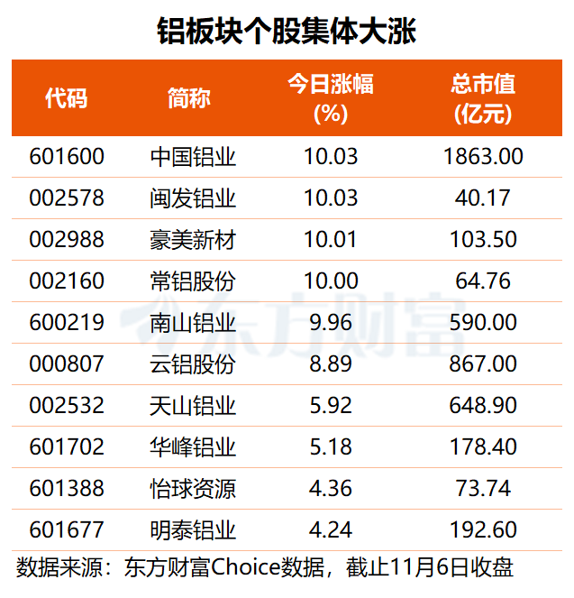 铝板块午后涨幅扩大,中国铝业封涨停,股价创阶段新高,其H股亦大涨超11%;闽发铝业、南山铝业、常铝股份等多股涨停,云铝股份、豪美新材等午后明显走强。期货市场方面,沪铝主力合约今日收涨1.29%。