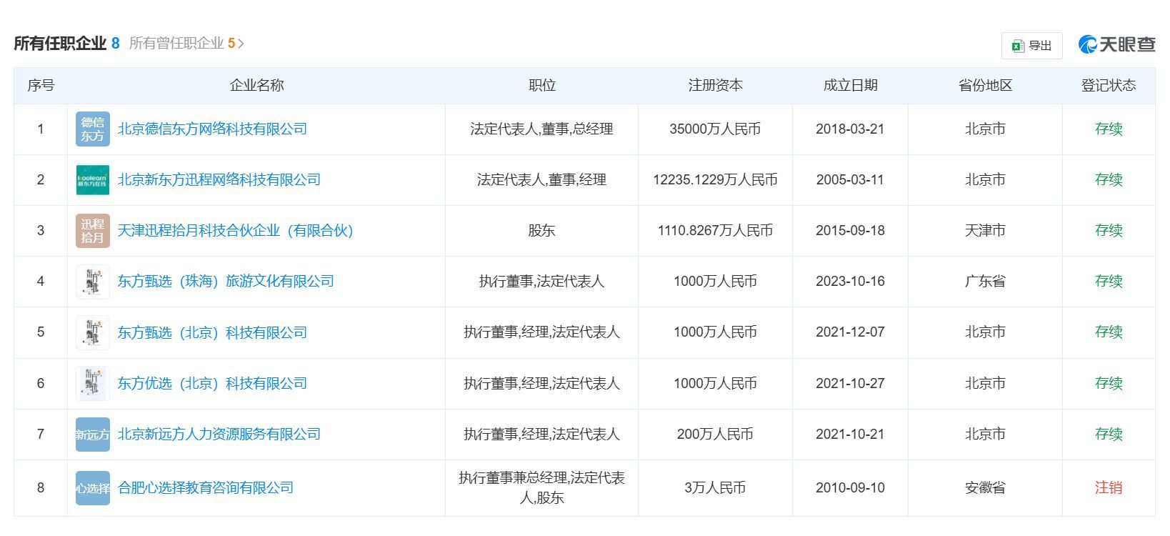 天眼查显示,孙东旭名下共关联8家企业,其中东方优选(北京)科技有限公司、东方甄选(北京)科技有限公司等7家为存续状态,孙东旭在上述企业担任执行董事、经理等职务;由其担任法定代表人和实控人的合肥心选择教育咨询有限公司目前已注销。