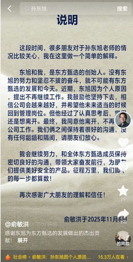 2025年8月22日,东方甄选发布声明称,孙东旭老师在休假中,并没有离职。自从2023年12月份之后,孙东旭老师一直以东方甄选和俞敏洪老师顾问的方式工作。俞敏洪老师与孙东旭老师一直保持着良好的沟通。