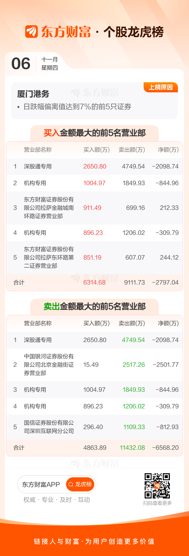 交易所2025年11月6日公布的交易公开信息显示,厦门港务因成为日跌幅偏离值达到7%的前5只证券上榜。厦门港务当日收报10.5元,涨跌幅-10.03%,偏离值-11.16%,换手率12.38%,成交额9.92亿。