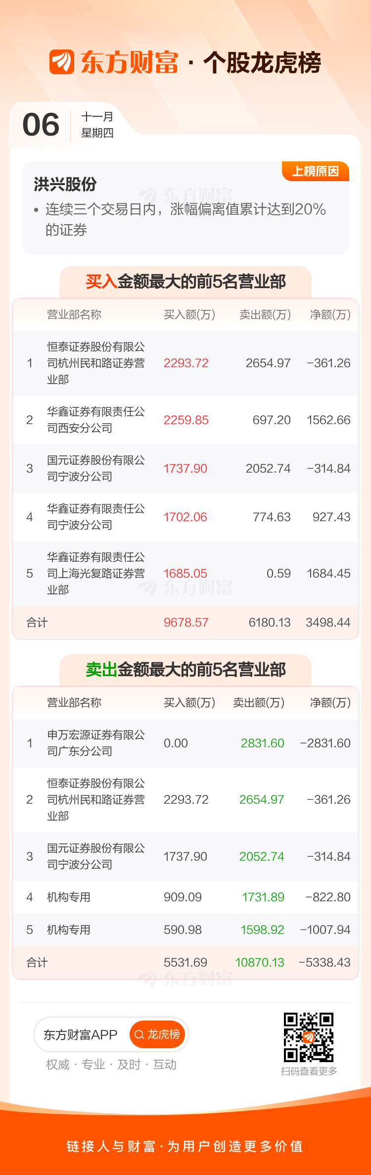 交易所2025年11月6日公布的交易公开信息显示,洪兴股份因成为连续三个交易日内,涨幅偏离值累计达到20%的证券上榜。洪兴股份当日收报23.96元,涨跌幅10.01%,换手率15.21%,成交额3.47亿。异常期间11月4日至11月6日,期间涨幅22.24%,累计偏离值21.99%,区间成交额5.56亿。