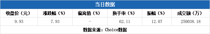 深交所2025年11月6日交易公开信息显示,中能电气因属于有价格涨跌幅限制的日换手率达到30%的前五只证券而登上龙虎榜。中能电气当日报收9.93元,涨跌幅为7.93%,换手率62.11%,振幅12.07%,成交额25.00亿元。